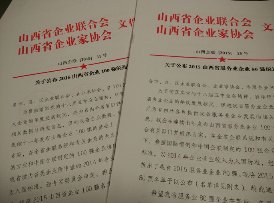 2015年12月9日,關(guān)于山西省企業(yè)聯(lián)合會(huì )、山西省企業(yè)家協(xié)會(huì )下發(fā)的文件《關(guān)于公布2015年山西省企業(yè)100強的通知》及《關(guān)于公布山西省服務(wù)業(yè)企業(yè)80強的通知》中,山西華宇集團在2015山西省企業(yè)100強中位列49名,在2015山西省服務(wù)業(yè)企業(yè)80強中位列12名。